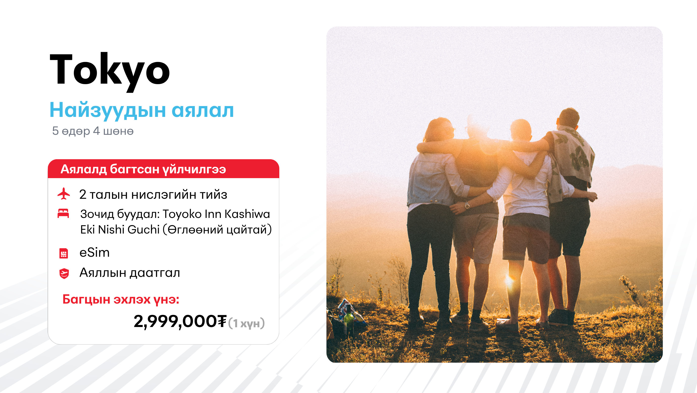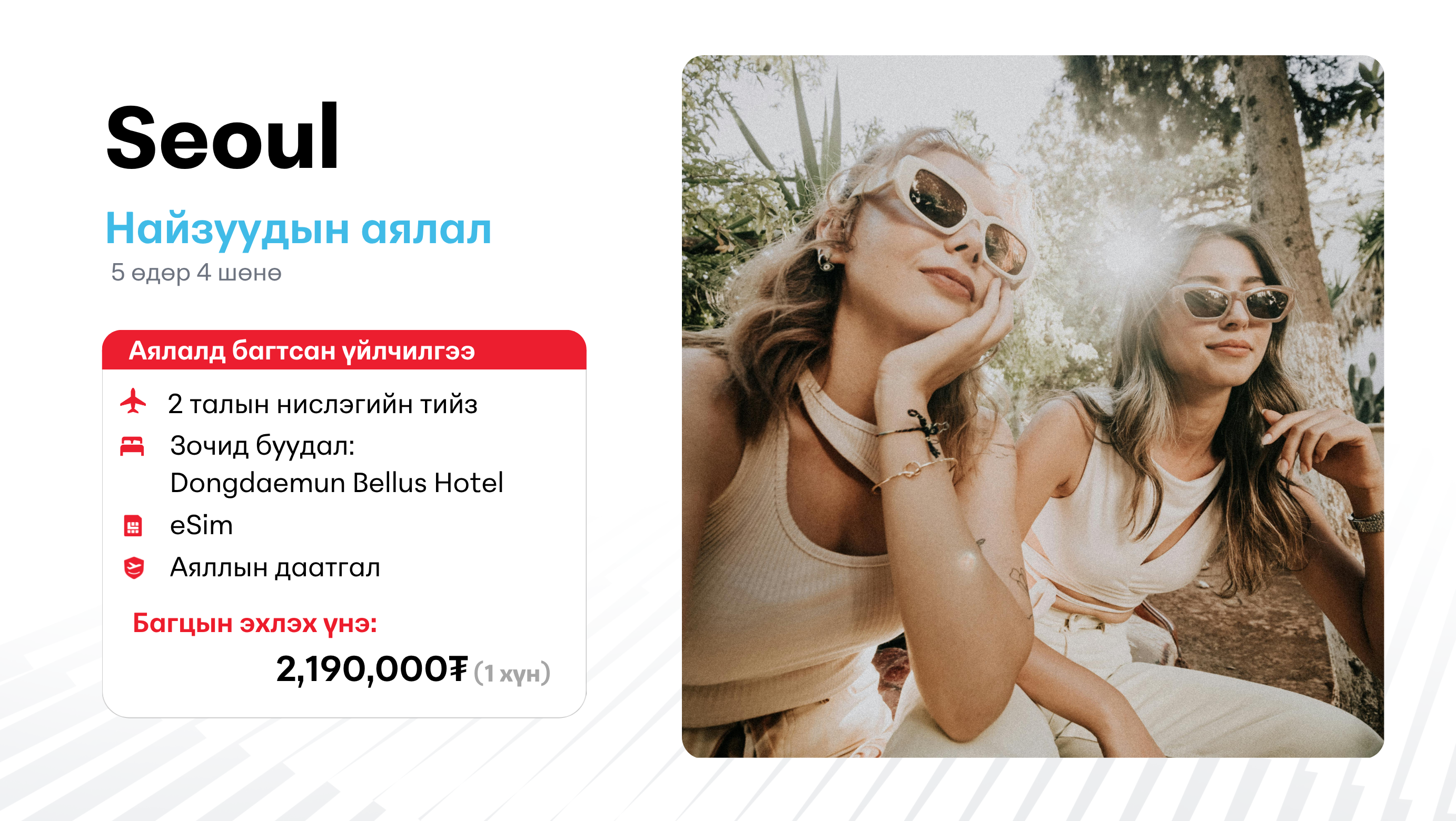 - Нислэг, зочид буудал, eSIM, аяллын даатгал, Тосох үдэх үйлчилгээ зэрэг бүх үйлчилгээг нэг дор багтаасан цогц шийдэл