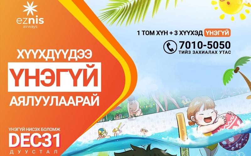 Та Улаанбаатар-Хонгконг чиглэлд 2 талдаа үнэгүй тээштэй, өдөр солиулах боломжтой Eznis Airways-н тийз худалдан аваад 14 хүртэлх насны 3 хүүхэдтэйгээ аялах эрх бэлэглэж байна. Урамшуулалт хамрагдаж байгаа хүүхэд холбогдох татвар хураамжаа төлөхийг анхаарна уу!