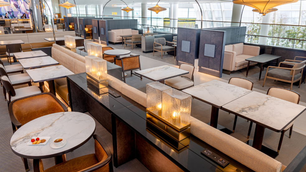 Лоунжийн зочны ширээ нь дээд зэрэглэлийн мод болон гантигаар урласан нь тогтвортой байдлын мэдрэмжийг бий болгодог. Дотоод гэрэлтүүлэг нь дулаан, тухтай, тансаг уур амьсгалыг бүрдүүлнэ. Өмнөх лоунжнууд нь голчлон хооллоход тохиромжтой орчинг бүрдүүлсэн байсан бол шинэчлэгдэснээс хойш хооллох орчин болон амттан идэх орчинг тус тусад нь бүрдүүлсэн байна. Тэнгэрт байгаа үүлсийг санагдуулам гэрэл зураг, дижитал арт зэрэг урлагийн бүтээлүүдийг байрлуулсан нь харах орчинг илүү бүрдүүлсэн хэрэг юм.